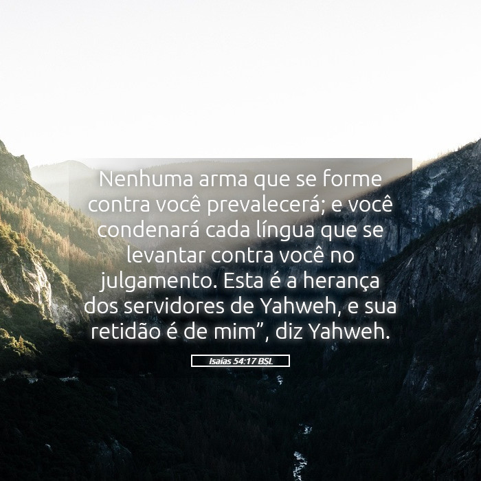 “Nenhuma arma forjada contra você prosperará, e toda língua que se levantar contra você em juízo, você a condenará. Esta é a herança dos servos do Senhor, e a sua justiça vem de mim, diz o Senhor.” (Isaías 54:17)
